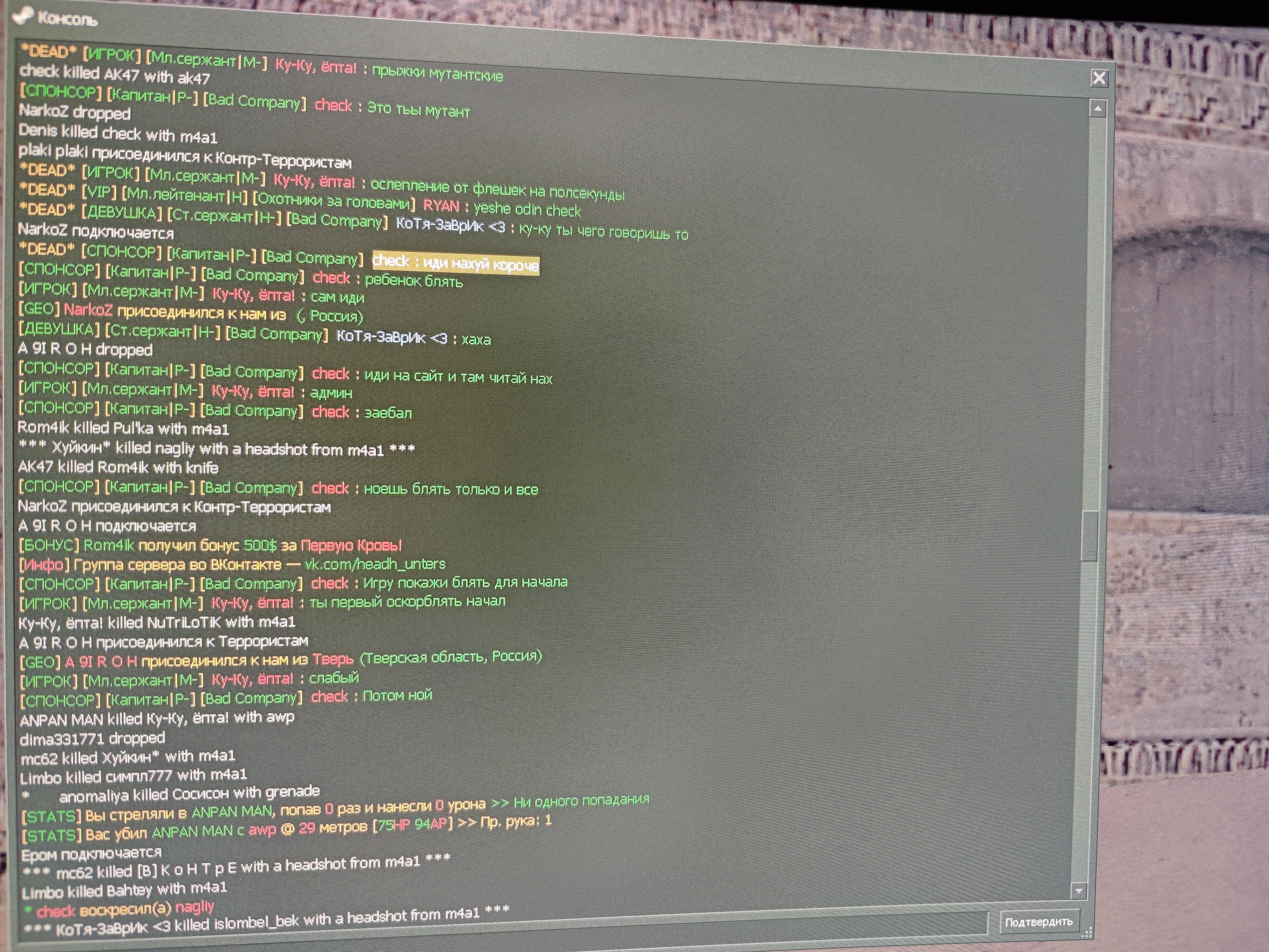 Добрый вечер, игрок с админкой check, оскорбляет игроков и банит чат, что делает не в первый раз. Сам первый начал оскорблять и тут же забанил чат, а после того как закрыл рот собеседнику начал в голсоовом чате оскоблять. Скрины имеются. Также высказывался оскорблениями в сторону игроков которые не купили вип прокачки в игре типа бедные нищие. Ранее также неадекватно он забанил игрока Rom4ik. Мой ник Ку Ку епта. Прошу администрацию сервера Head Hunters обратить внимание на неадвекватное поведение cheka, в обычном разговоре не найдя никаких слов начинает оскорблять и банить, показывая не мужское поведение и слабость. Фразы из чата которые он адресовал мне: "иди на *уй короче" "*аебал", "ребенок *лядь" и т.п. изречения а после всего заблокировал, при том что я его не оскорблял. Неужели при покупке впиа можно беспределить и оскорблять людей? Я думаю это неправильно, и випку может купить также и неадекватный человек. Все это он начал говорить после того как ему было указано что без прокачек купленных он не смог бы так играть, а он оспаривал что ни одна прокачка ему не помогает и он и без них был бы лучший, что уже глупейшее заявление ибо любому человеку понятно что прокачки увеличивают скилл игроков КРАТНО. Всем адекватным игрокам и настоящим мужчинам и девушкам сервака Хеад Хантерс привет. Дата чата 21:20 03.12.2025. Особо на что то не надеюсь ибо чек тут денег внес а я нет, но люди которые так разрушают баланс и справедливость на сервере должны быть на карандше.