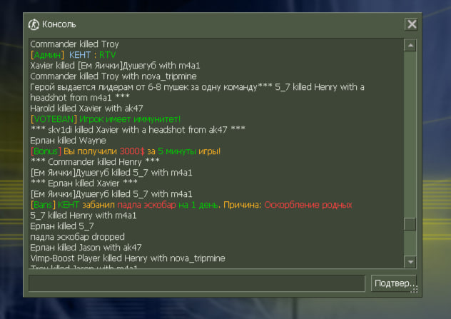 Здравствуйте, пишу жалобу на игрока АДМИНА KEHT, человек купил привелегию и злоупотребляет ею, он кикнул меня за то что я играл против него за террористов и вывозил всю игру против его команды, так он решил свою проблему сказав мне чтобы я отдхонул. ТАК-ЖЕ после этого когда я зашел ОН кикнул другого игрока "падло эскобаро" тоже потому что тот так играл играл против него и вывозил игру, с ПРИЧИНОЙ С его слов "ТЫ СИДИШЬ НА БАЗЕ И НЕ ВЫХОДИШЬ", после словесных их разборок, он забанил "падло эскобар"